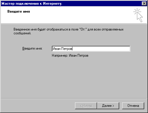 2. При первом обращении автоматически активируется мастер подключения к интернету. Если этого не произошло, запустите Мастер настройки почтового ящика из меню "Сервис -> Учётные записи -> Добавить -> Почта". На первом экране Мастера введите ваше имя, которым будут подписываться все исходящие письма и нажмите "Далее".