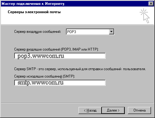 4. Укажите сервер входящих сообщений (POP3) - pop3.wwwcom.ru и сервер исходящих сообщений (SMTP) - smtp.wwwcom.ru и также нажмите "Далее".