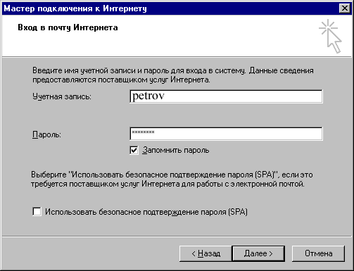 5. Далее укажите имя Вашей учетной записи (первая чать e-mail) и пароль, для сервера входящих сообщений. Остальные параметры рекомендуется оставить без изменений и перейти к следующему экрану, нажав кнопку "Далее".